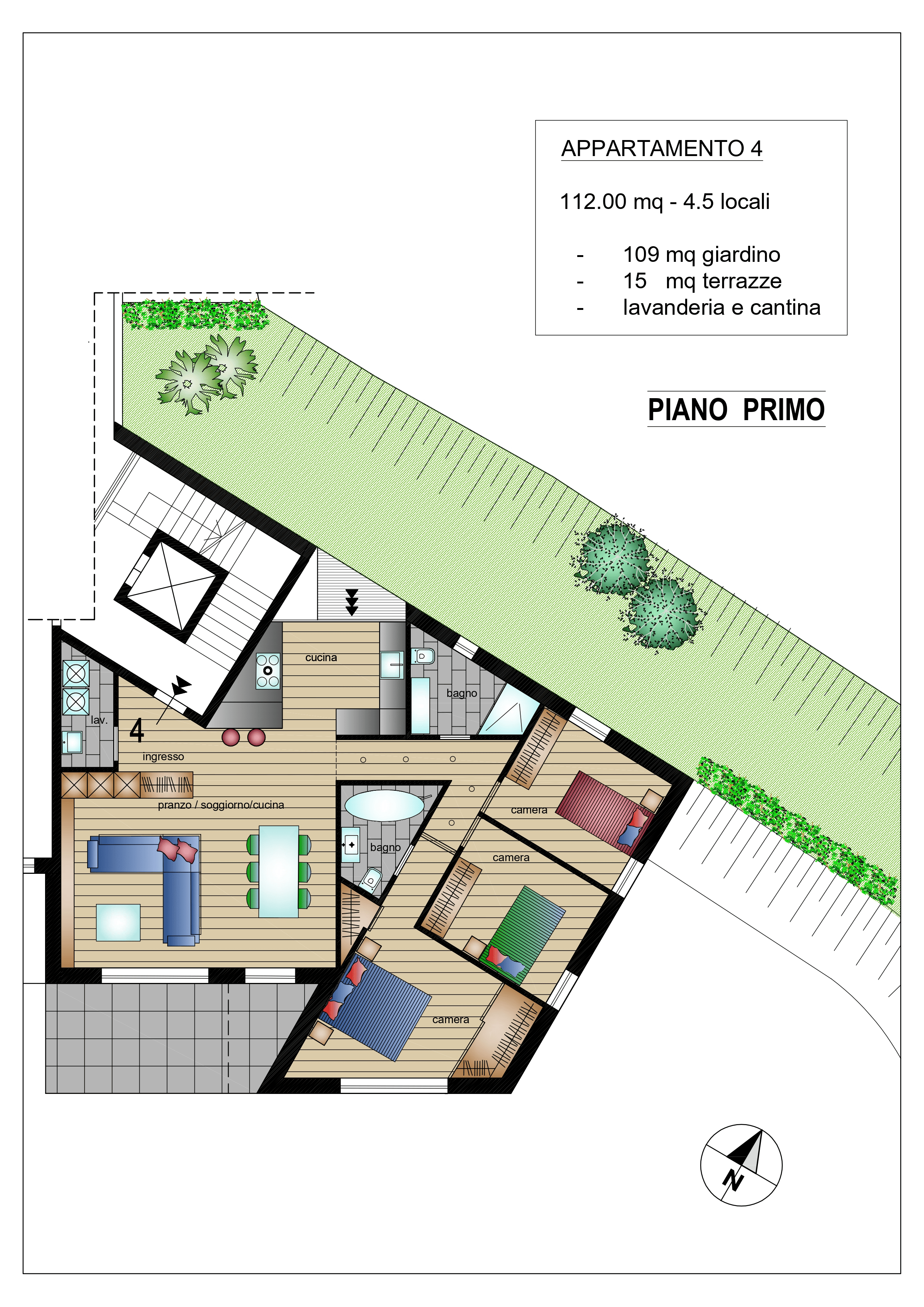 Questo Appartamento al Primo Piano presenta una superficie di ca 145 mq e offre spazi comodi e luminosi. Dispone inoltre di un Giardino di ca 80 mq e una Terrazza Panoramica di ca 15 mq, luoghi ideali per godere di momenti di relax all’aria aperta.